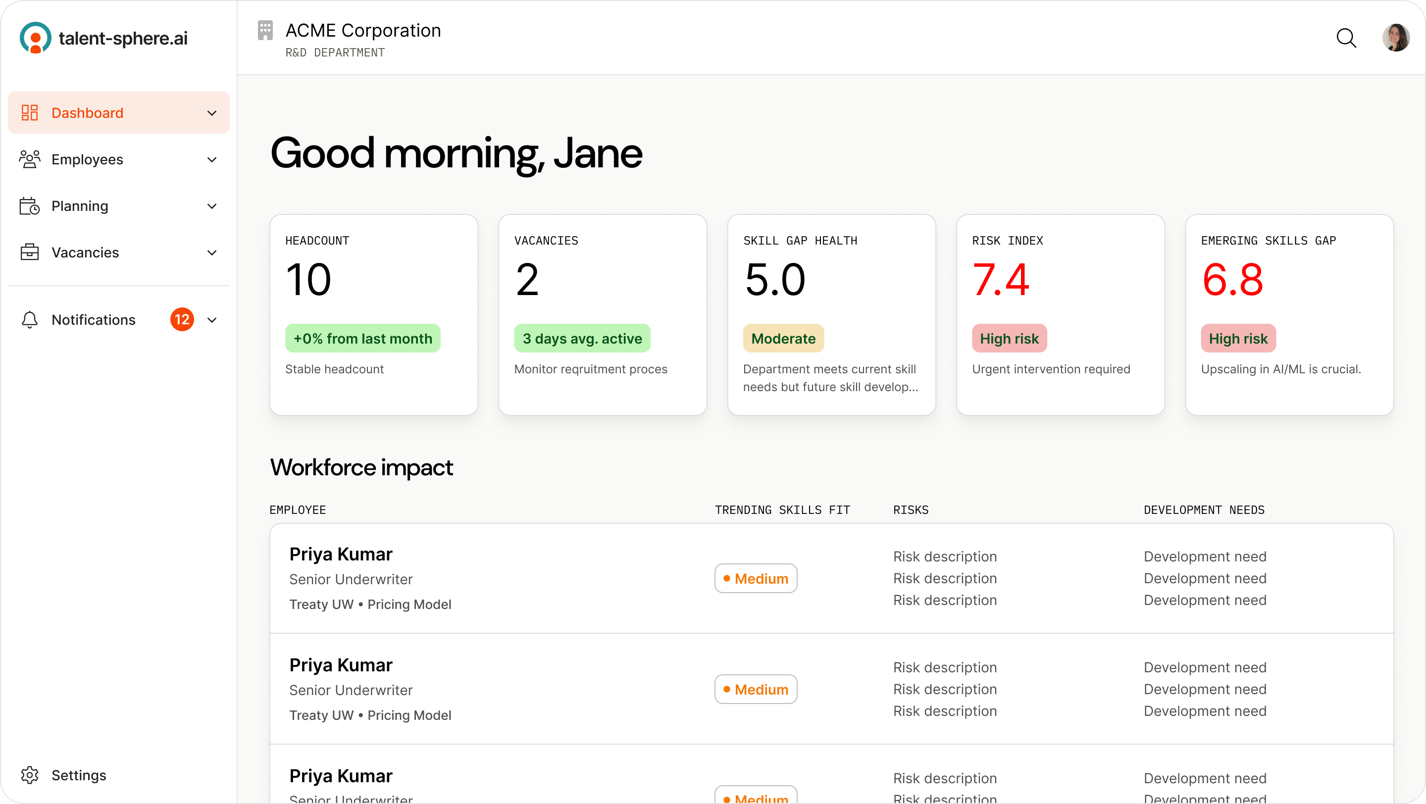 A skills intelligence layer that connects talent data to real decisions, powered by Sphere.ai™, connecting how you hire, develop, deploy talent with your business strategy